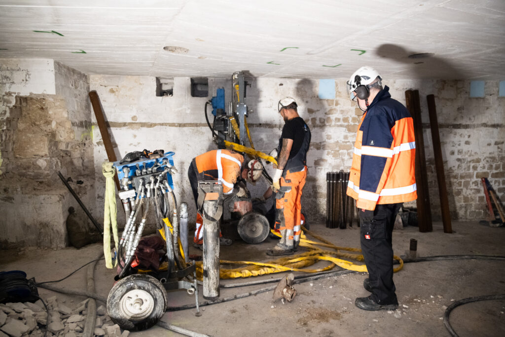 Zum Einsatz kommen Mikropfähle des Systems TITAN mit Stahlübergangsrohren von 2,10 m Länge. Die Arbeiten werden durch die komplexe Bestandssituation zusätzlich erschwert: geringe Abstände zu Bestandswänden, nachträgliche Abbrucharbeiten sowie angepasste Pfahlpositionen erfordern eine präzise Planung und hohe Flexibilität in der Ausführung.