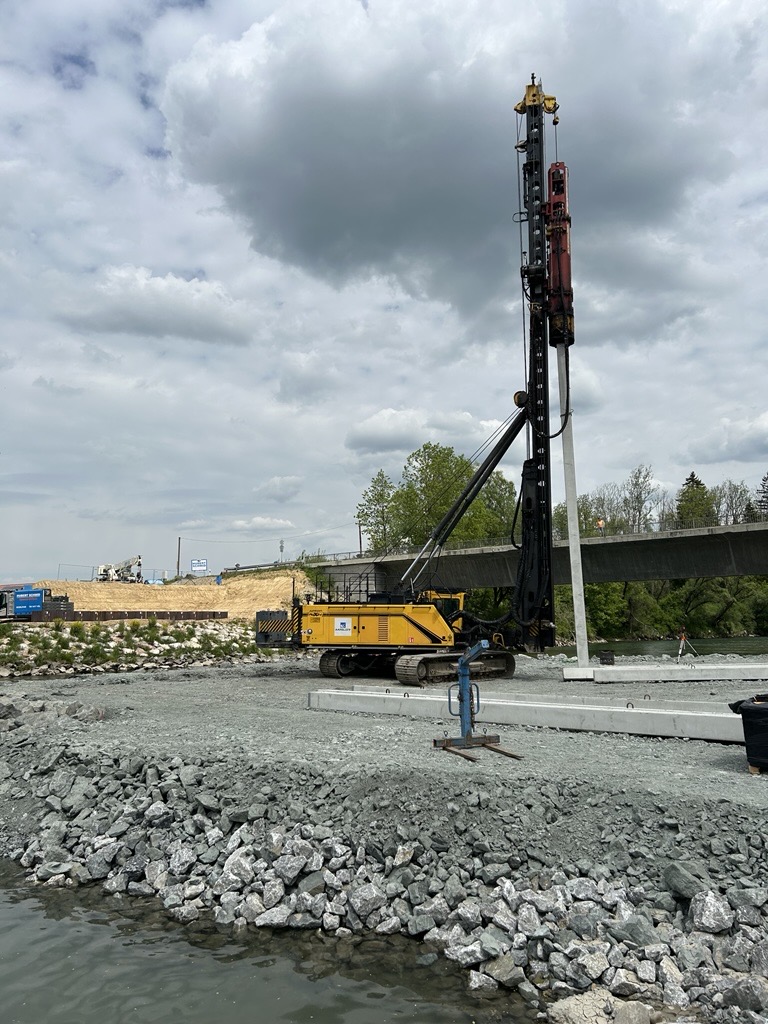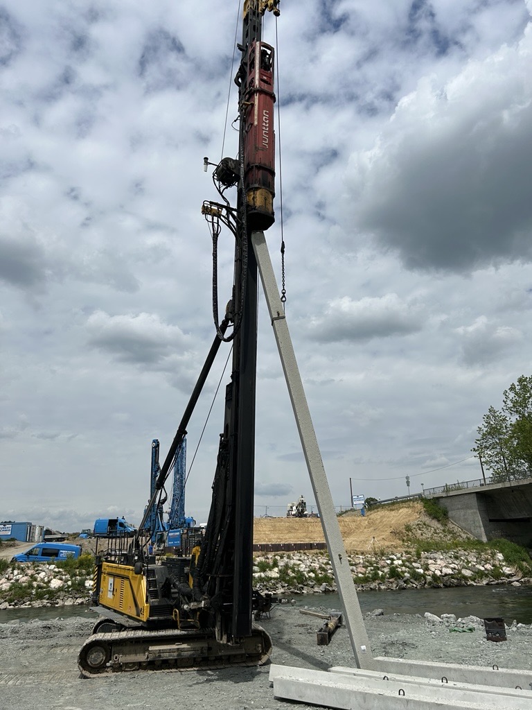 Für den Neubau einer 700 m langen Lärmschutzwand an der B16 nahe Ingolstadt wurden 400 CENTRUM- Pfähle mit einem Pfahlquerschnitt von 30×30 cm und einer Pfahllänge bis zu 9 m unter beengten Platzverhältnissen installiert. Zum Einsatz kam hierfür unsere BANUT 300 mit einem Betriebsgewicht von 30 to. und einem Hydraulikrammbär mit einem Fallgewicht von 2,5 to. Der Baugrund besteht aus locker bis mitteldicht gelagerten Sanden, zudem mussten zum Einbringen der Stahlbetonfertigpfähle mehrere Lagen geogitterbewehrte Erde durchrammt werden. Zur Sicherung der Arbeitsebene wurde die bahnseitige Böschung durch eine Vernagelung und Spritzbetonsicherung stabilisiert.